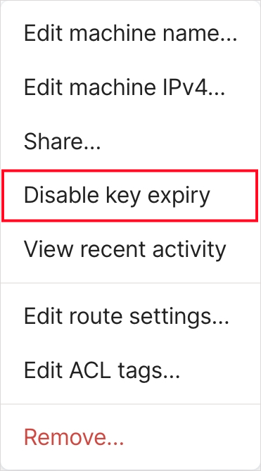 설정 1가지를 더 해줘야 하는데요. 바로 해당 노드의 key 만료를 비활성화해야 합니다. 키의 경우 기본적으로 3개월마다 만료되는데 키가 만료되면 통신이 모두 끊어지니 비활성화를 해야 합니다. 관리 콘솔의 해당 노드 설정에서 Disable key expiry 를 클릭해주시면 됩니다.