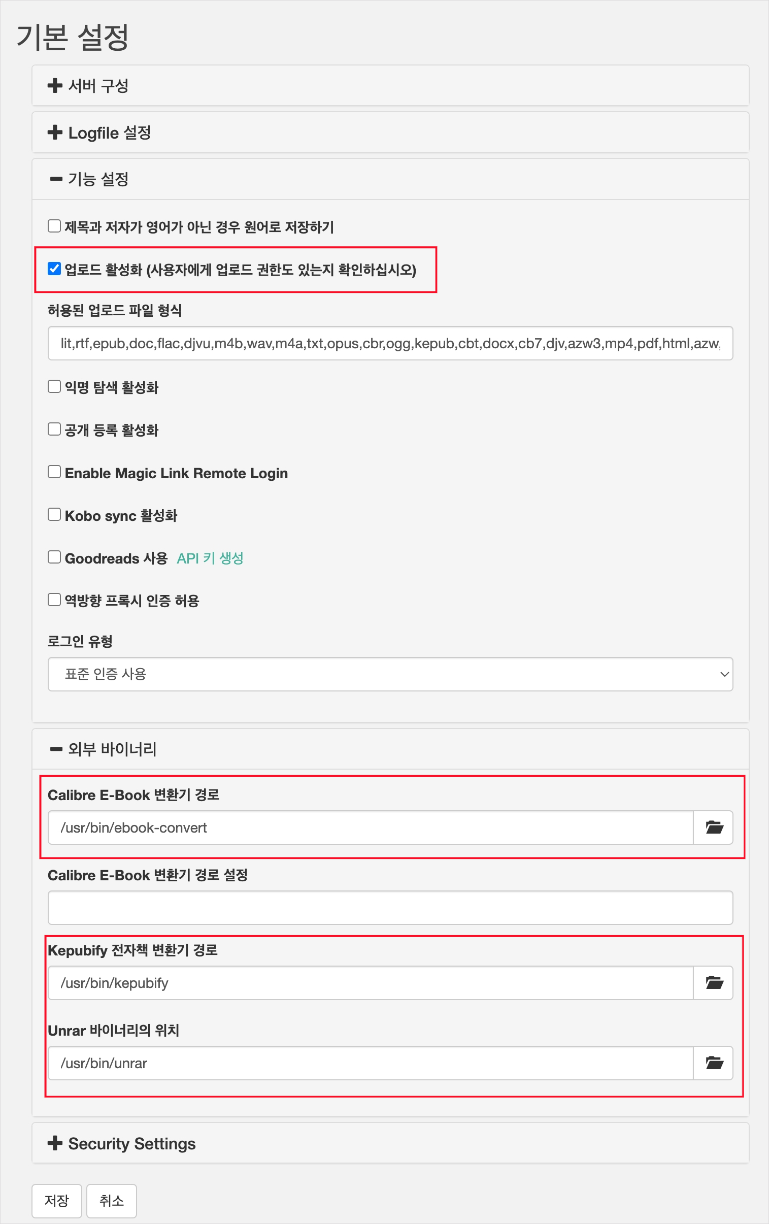 이후 관리자 메뉴에서 기본 환경 설정 편집을 클릭하고 기능 설정에서 업로드 활성화를 체크해주세요. 외부 바이너리는 다음과 같이 입력해주세요. 해당 설정은 64비트 CPU(intel, amd CPU) 를 사용하는 서버에서 가능합니다.