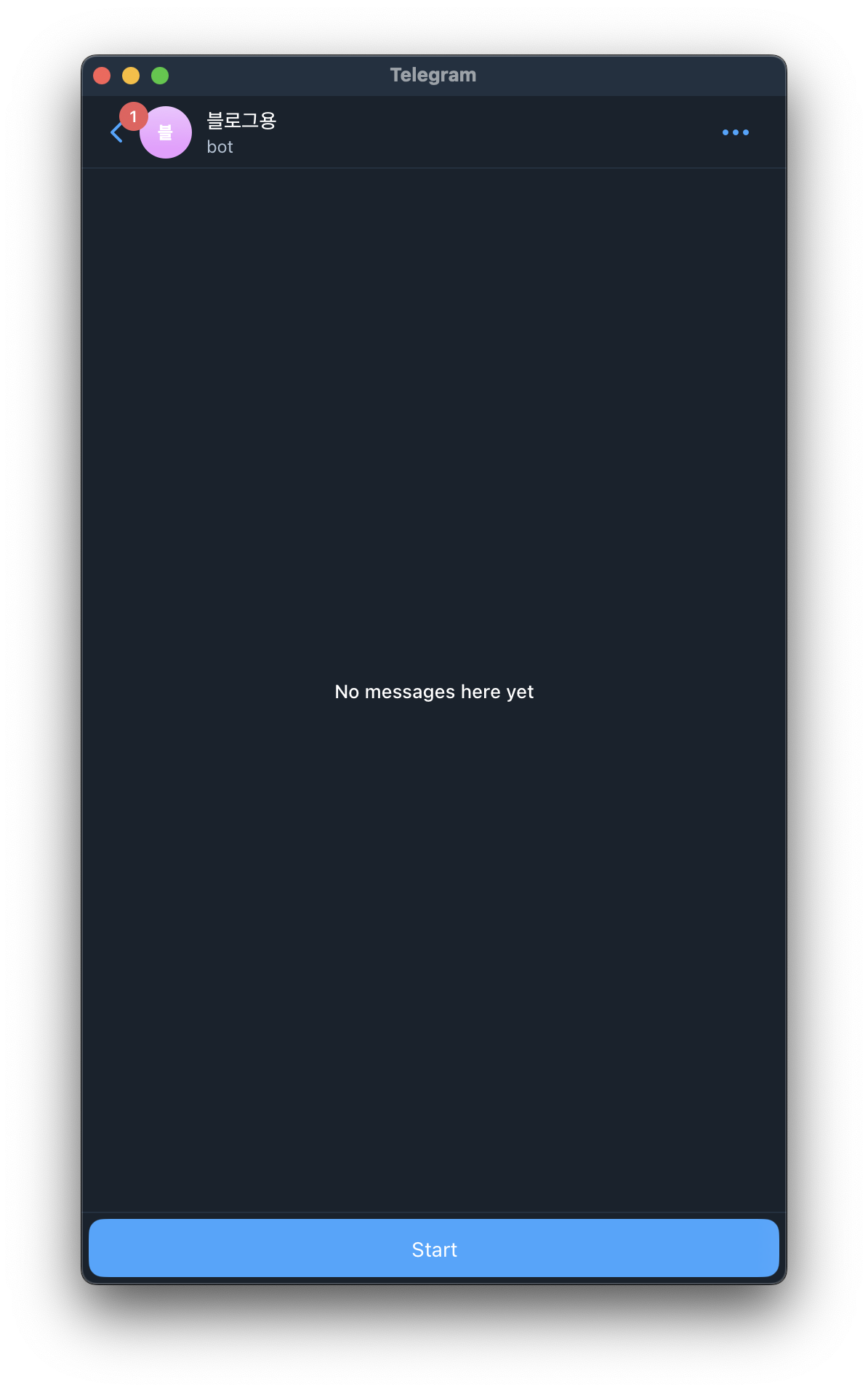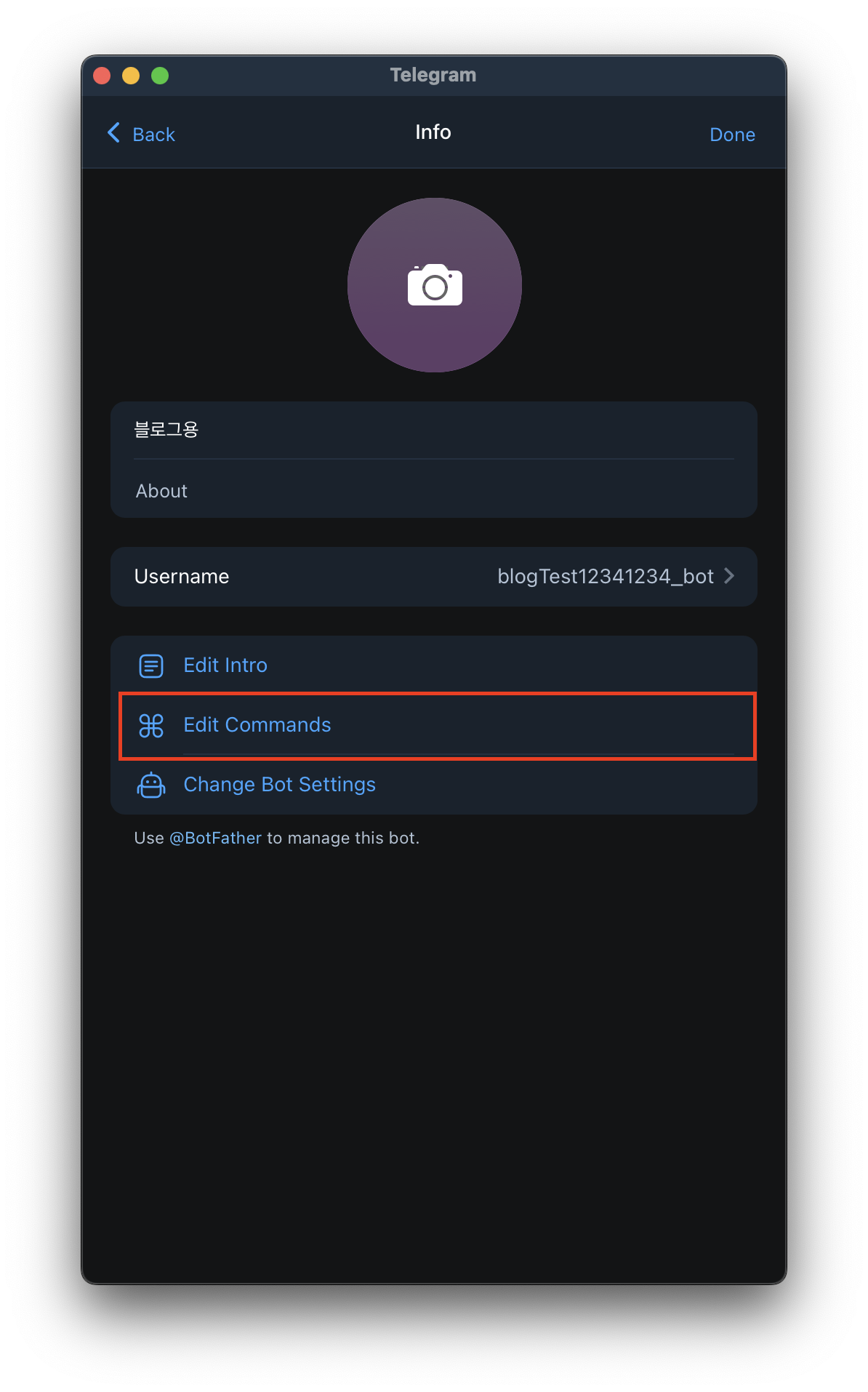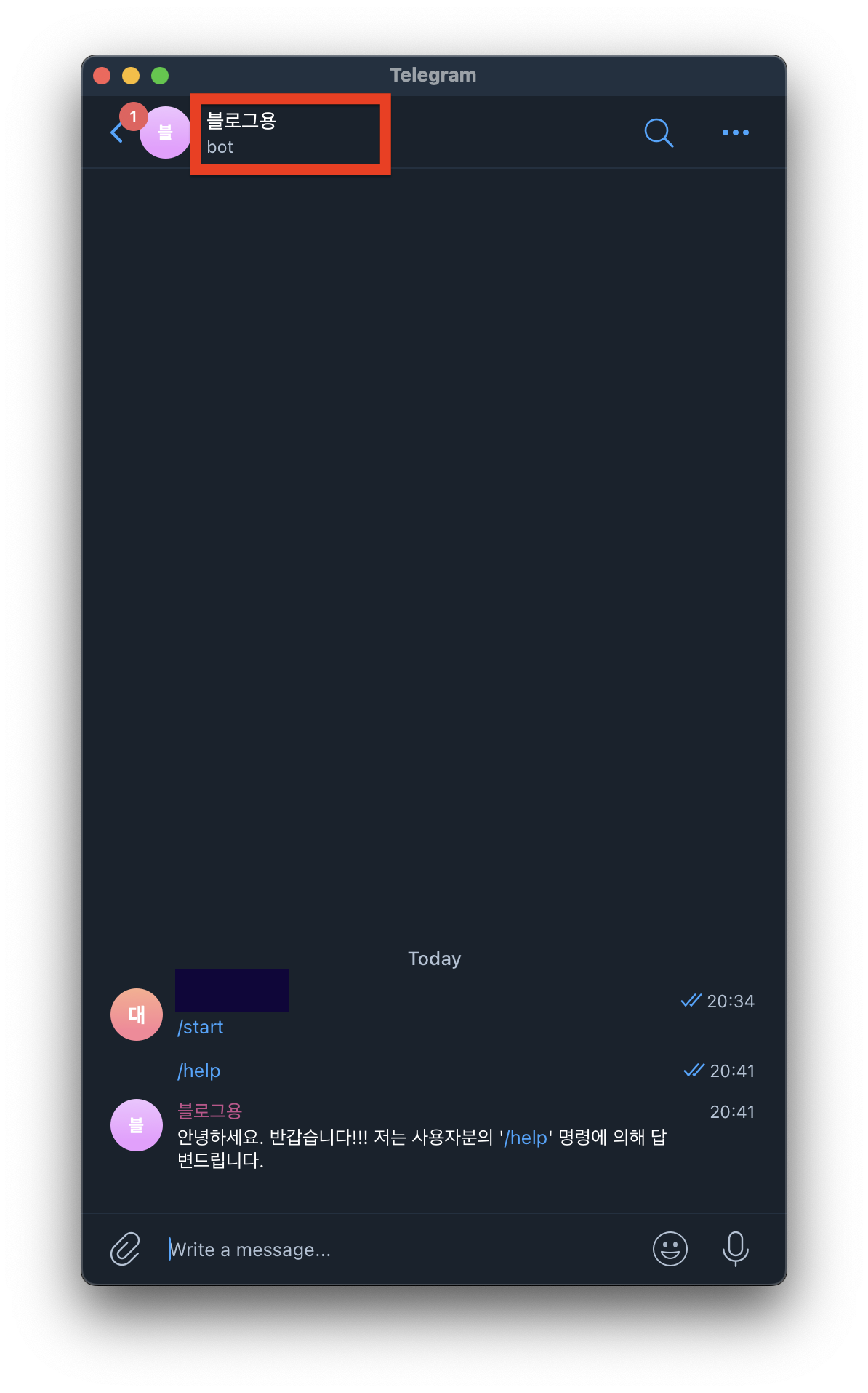 - 이후 봇 채팅방 이름을 정합니다. 저는 블로그용 이라고 작성했습니다.