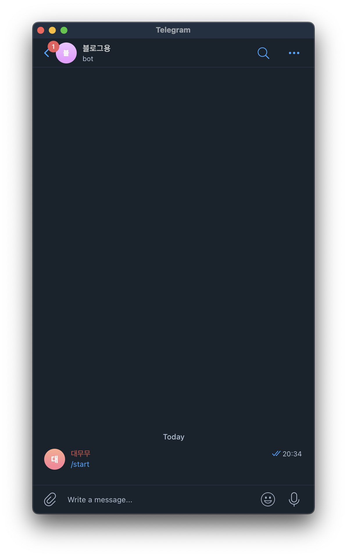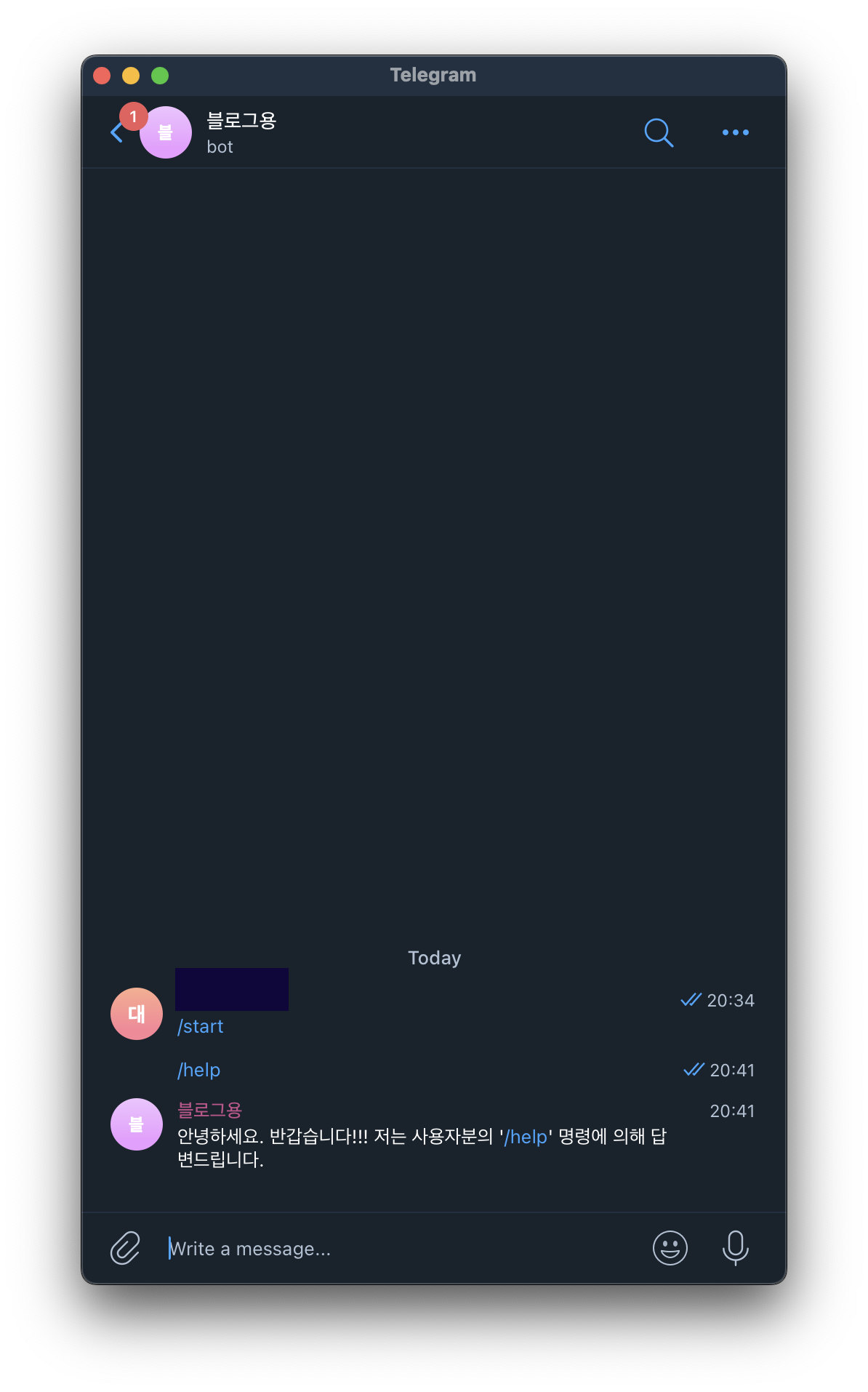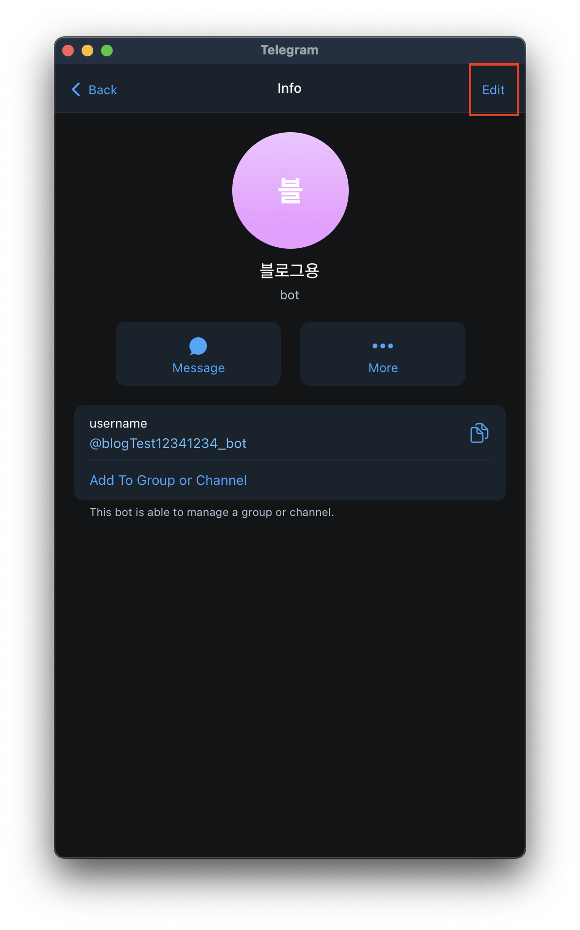 - 이후 봇 채팅방 이름을 정합니다. 저는 블로그용 이라고 작성했습니다.