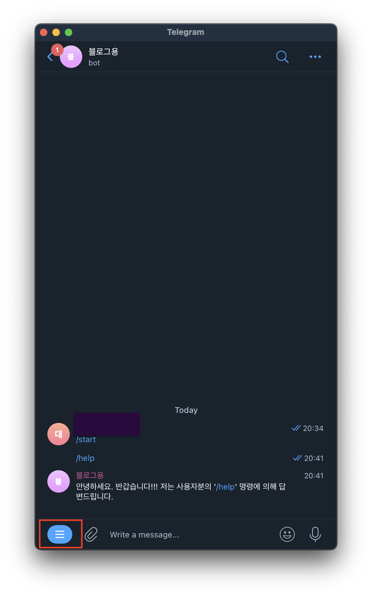 - 이후 5분 정도 대기 후 봇 채팅창을 입장하면 왼쪽 하단에 메뉴바가 생긴 것을 확인할 수 있습니다. 해당 메뉴바를 클릭하면 지정했던 명령과 설명이 표시됩니다.