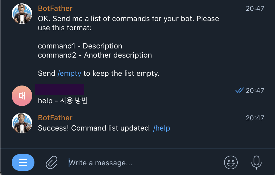 - BodFather 채팅창에서 다음과 같이 추가할 명령과 명령 설명을 입력합니다.