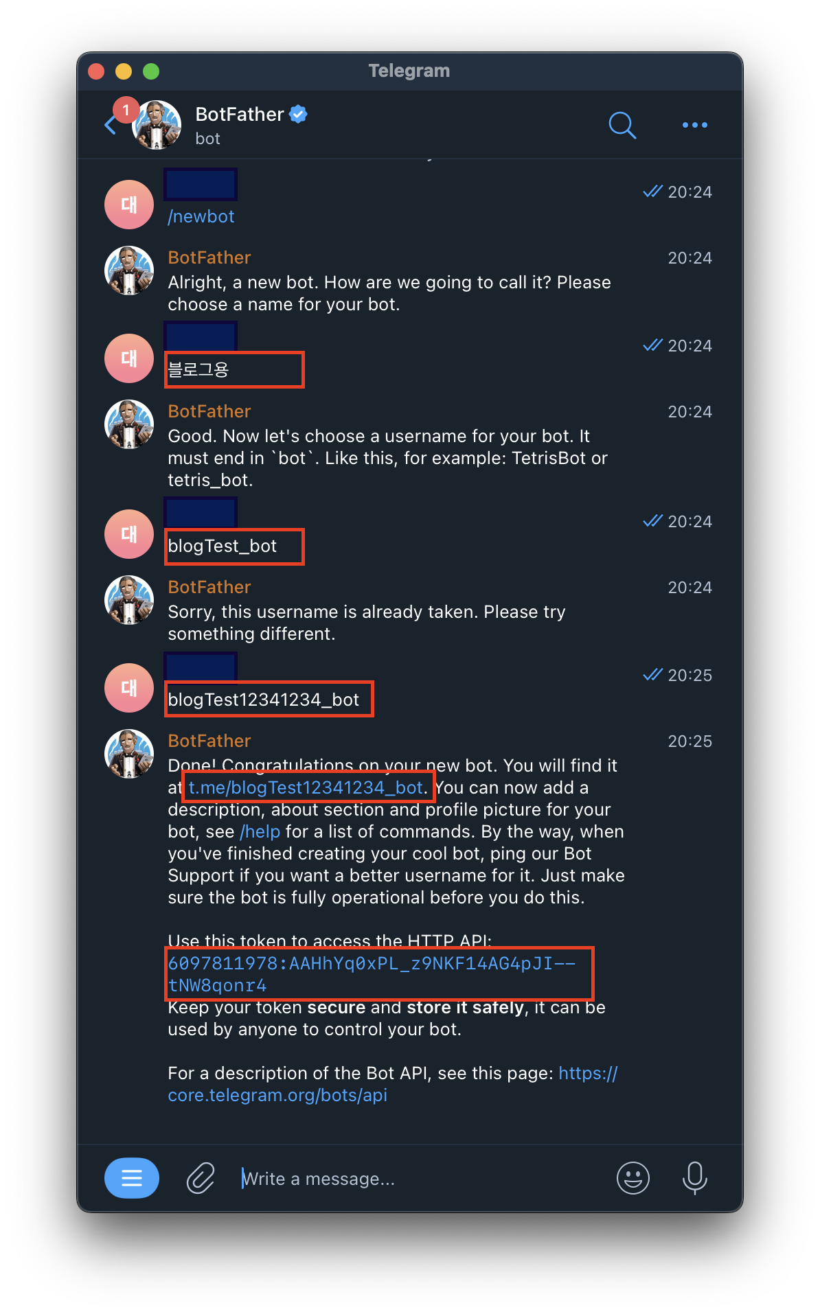 - 봇의 이름을 정합니다. 여기서 중요한 점은 _bot 이라고 끝나야 합니다. 저는 blotTest12341234_bot 이라고 작성했습니다. blogTest_bot 은 이미 있다고 거절당한 것을 이미지에서 확인하실 수 있습니다.