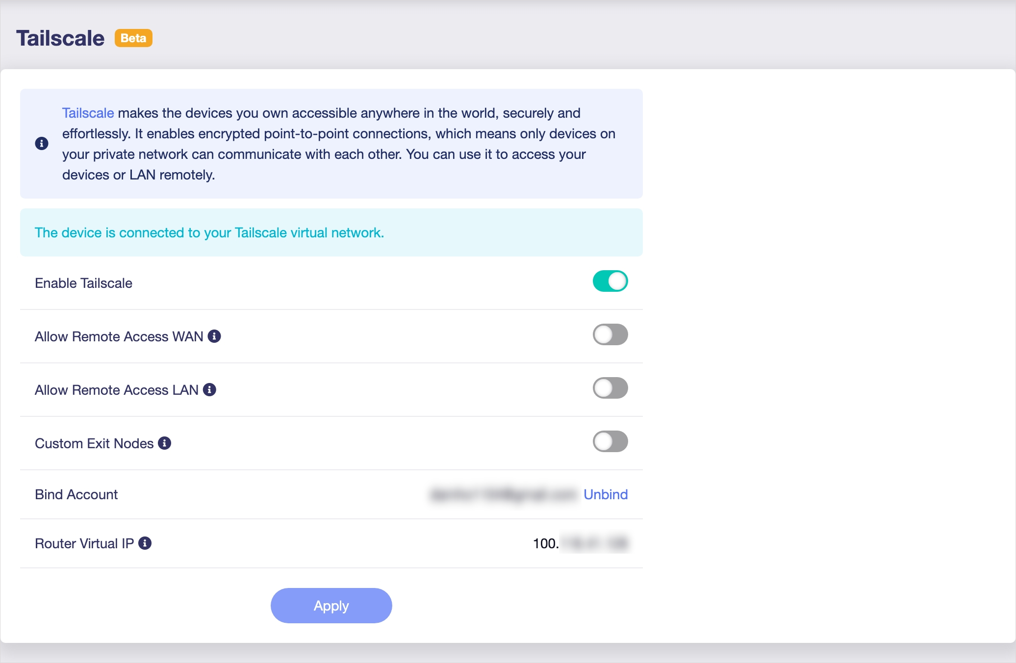 TailScale 설정을 진행해보겠습니다. Applications -> Tailscale 을 클릭하면 활성화 버튼이 나옵니다. 활성화 버튼을 클릭하면 공유기를 Tailscale 에 등록할 링크가 나오고 해당 링크를 클릭하여 로그인하여 등록을 마칩니다. 등록 과정은 제가 설명드린 Tailscale 글을 참고하시기 바랍니다.
