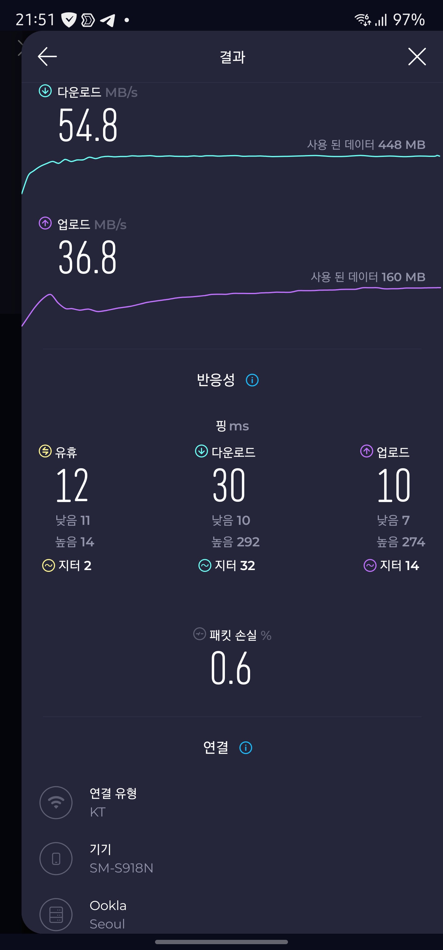 현재 500 Mbps/s KT 인터넷을 사용중인데요. 해당 속도를 거의 다 만족하는 수준까지 나오는 것을 확인하실 수 있습니다. 핑도 무선으로 이 정도면 만족스러워 보입니다.